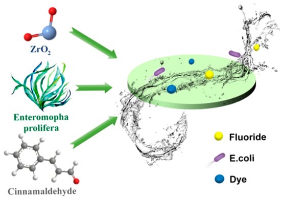 - Lei, Y.; Li, W.Y.; Han, Y.H.; Wang, L.P.; Wu, H.; He, P.; Wei, G.; Guo, L. Biomimetic ZrO2-modified seaweed residue with excellent fluorine/bacteria removal and uranium extraction properties for wastewater purification. Water Res. 2024, 252, 121219. [Google Scholar] [CrossRef] [PubMed]