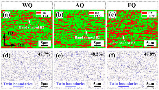 To investigate the effects of the different cooling rates on the microstructure of the Fe-18Mn-10Al-1C-5Ni steel, EBSD analysis was conducted, and the results are presented in Figure 1. Based on the phase distribution map, it is evident that as the cooling rate decreased, the volume fraction of the B2 phase increased. Specifically, the volume fractions of the B2 phases in the WQ (Figure 1a), AQ (Figure 1b), and FQ (Figure 1c) samples were 24.5%, 25.8%, and 41.4%, respectively. Concurrently, the grain sizes of both the austenite and B2 phases also increased with the decreasing cooling rate. In detail, the average grain sizes of the B2 phases in the WQ, AQ, and FQ samples were 1700 nm, 2100 nm, and 3700 nm, respectively, while the average grain sizes of the austenite were 2200 nm, 2700 nm, and 4900 nm, respectively. Additionally, the morphology of the B2 phases underwent changes. Compared to the WQ and AQ samples, the volume fraction of the band-shaped B2 phase in the FQ sample significantly increased, and its size became noticeably coarser. The annealing twins were less influenced by the cooling rate, with their proportion fluctuating between 47.7% and 48.8%, as shown in Figure 1d–f.