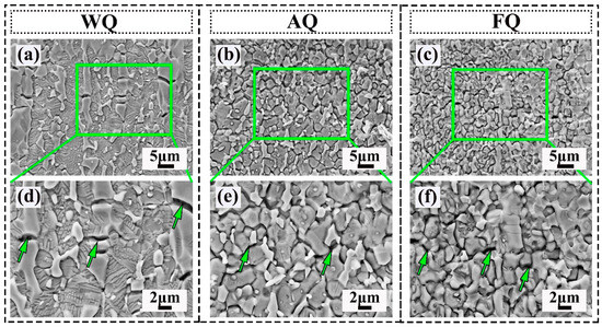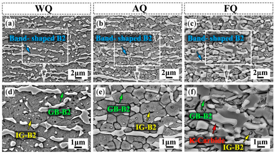 To further investigate the effects of the different cooling rates on the microstructure, the SEM microstructures of the three samples are shown in Figure 2. In these three samples, the polygon B2 phases (GB-B2) and strip-shaped B2 phases (band-shaped B2) are distributed at the grain boundary, as shown in Figure 2a–c. At the same time, small B2 particles can be observed inside the austenite grains (IG-B2) of the WQ sample (Figure 2d) and AQ sample (Figure 2e). However, IG-B2 particles within the grains of the FQ sample are relatively rare (Figure 2f). New precipitates appeared at the grain boundaries of the austenite and B2 phases in the FQ sample. Previous studies [24] on Fe-Mn-Al-C steel have shown that furnace-cooled austenite tends to form κ-carbides at the grain boundaries. According to reports from Choi et al. [14], prolonged aging treatment can lead to the formation of coarsened κ-carbides at the austenite grain boundaries and B2 phase boundaries. Therefore, the precipitated phase appearing at the austenite boundary in the FQ sample may have been κ-carbides.