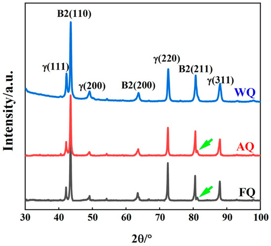 To investigate the effects of the different cooling rates on the phase composition of the Fe-18Mn-10Al-1C-5Ni lightweight steel, Figure 3 shows the XRD patterns of the WQ, AQ, and FQ samples. From Figure 3, it can be seen that the XRD patterns of the three samples all exhibit diffraction peaks of austenite (γ) and B2 phases, indicating that the microstructure is composed of austenite and B2 phases. Upon careful analysis, it can be observed that the XRD spectra of the AQ and FQ samples exhibit satellite peaks in the gamma peak, with clear sideband effects, as shown in Figure 3. The results indicate that the Fe-18Mn-10Al-1C-5Ni lightweight steel underwent amplitude modulation decomposition, with the formation of κ-carbide precipitates in the matrix. According to the Bragg diffraction law, as the interplanar spacing (d) increases, the diffraction angle (θ) decreases. Due to the lattice constant of this carbide being greater than that of γ-Fe, the interplanar spacing increased, resulting in a leftward shift of the diffraction peak. Through comparison, it was found that the edge band peak of the FQ sample was the most obvious, and the peak shifted to the left at the largest angle, indicating that the ordered kappa carbide content was the highest at this time. Ordered κ-carbides in the austenite matrix of high-manganese and high-aluminum lightweight steel are formed through amplitude modulation decomposition, exhibiting an L12 structure. [8,11,24,25,26], which can be analyzed by XRD.