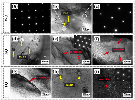 To distinguish the effects of water quenching, air quenching, and furnace quenching on the size and distribution of κ-carbides and B2 phases in this research, we conducted TEM analysis on the three samples, and the results are shown in Figure 4. As shown in Figure 4b, in the WQ sample, B2 particles were formed inside the austenite grains with an average grain size of 230 nm. The diffraction pattern confirmed its ordered BCC crystal structure (Figure 4a). Meanwhile, according to the diffraction pattern from Figure 4c, κ-carbides were not found in the WQ sample. For the AQ samples, there was no significant change in the size of B2 phase (239 nm) within the grains (Figure 4d), but nanoscale κ-carbides appeared at both the grain boundaries and within the grains (Figure 4e,f). As a precipitation hardening phase in Fe-Mn-Al-C lightweight steel, κ-carbides can significantly enhance the tensile strength of the material [11]. In contrast, the B2 phases inside the grains in the FQ sample slightly coarsened and increased in size to 332 nm (Figure 4h). In addition, the κ-carbides inside the grains (Figure 4i) and at the grain boundaries (Figure 4g) were significantly coarsened, especially at the grain boundaries, where the size reached 170 nm. The results indicate that adjusting the cooling method can effectively regulate the size and distribution of B2 phase and κ-carbides precipitates in Fe-18Mn-10Al-1C-5Ni lightweight steel, thereby achieving the optimization of the tensile properties.