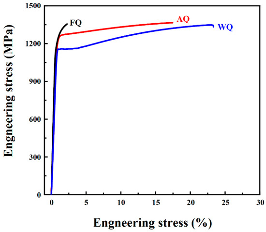 The engineering stress–strain curves of the WQ, AQ, and FQ samples are shown in Figure 5. Both the WQ and AQ samples exhibit a good combination of ultra-high strength and good ductility, while the FQ sample shows severely deteriorated elongation. Specifically, the yield strength and ultimate tensile strength of the WQ sample were 1094 MPa and 1315 MPa, respectively, with an elongation of 23.3%. The yield strength and tensile strength of the AQ samples further increased, reaching 1232 MPa and 1347 MPa, respectively, while the elongation slightly decreased to 17.4%. It is worth noting that compared to the AQ sample, the yield strength and tensile strength of the FQ sample did not change much at the levels of 1251 MPa and 1357 MPa, respectively, while the elongation rate significantly decreased to 2.3%.