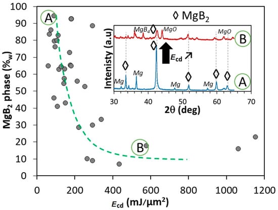 The highest value of the MgB2 weight fraction was found for Ecd, included in the 60–200 mJ/μm2 domain. Below 60 mJ/μm2, the sintered layers crumbled to powder, and above ∼200 mJ/μm2, the fraction of the MgB2 phase in the obtained samples rapidly decreased (Figure 1 insert), while the samples themselves were overheated.