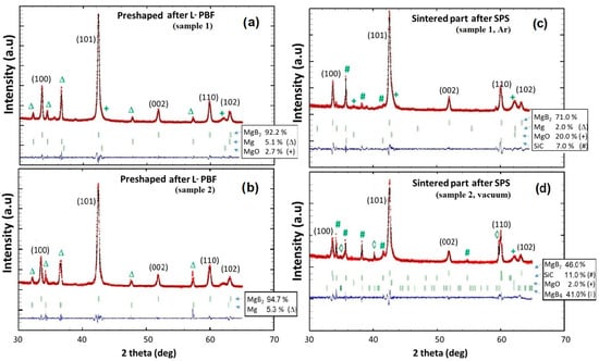 XRD patterns of the preform with 92% of MgB2 (a) and the final part (the same preform) obtained after SPS (c) (sample 1), and XRD patterns for comparative sample with 95% of MgB2 after SLS (b) and SPS (d) (sample 2). The red lines correspond to the Rietveld refinement patterns, the blue lines are the difference between the Rietveld and the experimental patterns.