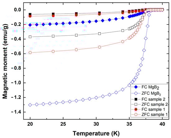 Superconductivity properties of selected samples were investigated by magnetic susceptibility measurements using a SQUID magnetometer, Quantum design MPMS 5, (San Diego, CA, USA) in the temperature interval of 20–40 K in both the zero-field cooling (ZFC) and the field-cooling (FC) modes.
