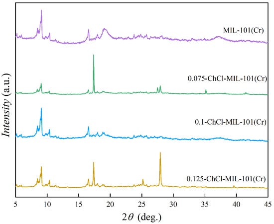 XRD images of MIL-101 (Cr), 0.075-ChCl-MIL-101 (Cr), 0.1-ChCl-MIL-101 (Cr), and 0.125-ChCl-MIL-101 (Cr).