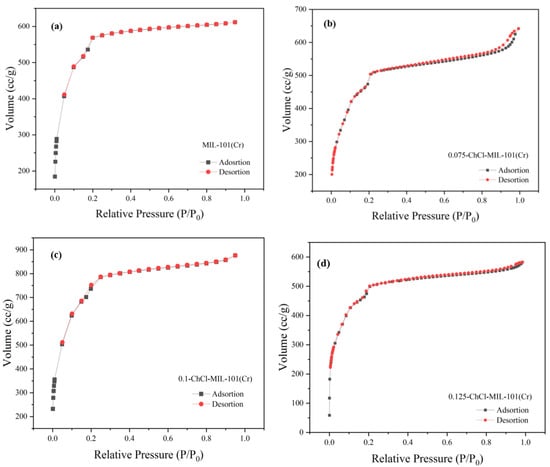 The adsorption breakthrough curves of adsorbents MIL-101 (Cr), 0.075-ChCl-MIL-101 (Cr), 0.1-ChCl-MIL-101 (Cr), and 0.125-ChCl-MIL-101 (Cr) are shown in Figure 4. From the isothermal trend lines, MIL-101 (Cr) adsorbents all belong to Class I isotherms, while 0.075-ChCl-MIL-101 (Cr), 0.1-ChCl-MIL-101 (Cr), and 0.125-ChCl-MIL-101 (Cr) belong to Class IV isotherms [53]. The N2 adsorption/desorption isotherms of these four different adsorbents appear similar but have significant differences. From Figure 4a, it can be seen that the adsorption–desorption curves almost overlap, indicating that the adsorption/desorption process did not produce a hysteresis loop. This means that the pore structure within the adsorbent is relatively small and contains a large number of microporous structures, with an adsorption capacity of 610 cc/g. From Figure 4b, it can be seen that there is a turning point around P/P0 = 0.2, which is the first steep point of the isotherm and represents the saturated adsorption capacity of its single molecule, indicating that its adsorption capacity is complete. However, the adsorption capacity still exceeds that of MIL-101 (Cr) before modification, reaching 641 cc/g. From Figure 4c, it can be seen that although 0.1 mol/L choline chloride modification has the best adsorption and desorption effect on nitrogen gas, reaching 830 cc/g, a narrow hysteresis loop appears around P/P0 = 0.18, indicating the presence of a large number of mesopores and relatively few micropores in the 0.1-ChCl-MIL-101 (Cr) sample. From Figure 4d, it is evident that the adsorption–desorption curves are essentially overlapping, with only a narrow hysteresis loop observed at P/P0 = 0.17 and P/P0 = 0.97, which represents a significant amount of mesopores, while the micropores are comparatively less. The adsorption capacity is 582 cc/g.