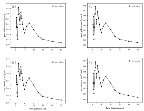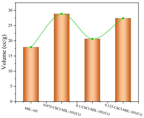 Compared with the former two, the values of the pore volume at certain pore sizes are different, indicating that as the ChCl content increases to 0.1 mol/L, the influence on the pore structure of the material is further intensified, altering the crystal growth or assembly process of the material and thus affecting the pore size distribution. For 0.125-ChCl-MIL-101(Cr), the pore volume also fluctuates significantly in the 0–10 nm region. However, compared with the other three materials, the details of the pore volume distribution are different. As the ChCl content increases to 0.125 mol/L, the pore structure of the material continues to be modified, influencing the pore formation mechanism of the material at the microscopic level and endowing the pore size distribution with unique characteristics.