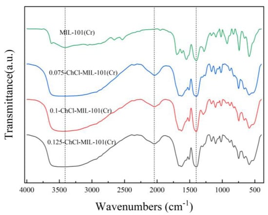 FT-IR images of MIL-101 (Cr), 0.075-ChCl-MIL-101 (Cr), 0.1-ChCl-MIL-101 (Cr), and 0.125-ChCl-MIL-101 (Cr).
