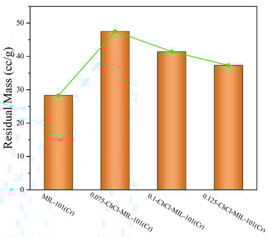 The comparison of the residual weights of four different materials is shown in Figure 8. After modification with choline chloride, there was a significant enhancement in both thermal stability and residual mass. At temperatures close to 400 °C, the 0.075-ChCl-MIL-101(Cr) can maintain structural integrity, with a mass loss of 52.49%. Compared to the original material, the residual mass increased by 59.54%. However, as the concentration of choline chloride increases, the thermal stability and residual mass start to decline gradually. This is attributed to the decomposition of choline chloride at high temperatures, leading to greater mass loss at higher concentrations, but still surpassing that of the original material.