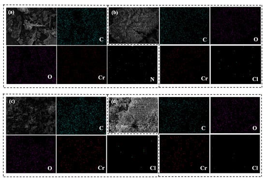 The incident electron beam was adopted to excite the primary X-rays of the sample material, and the varying energy and wavelengths of the distinctive X-rays were examined to determine the sorts of elements. The composition of each component in the sample material was determined by comparing the content of five elements: C, O, Cr, Cl, and N [13].
