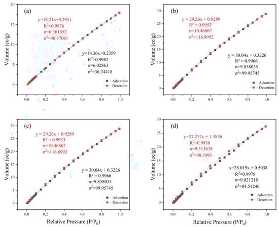The Langmuir equation is one of the most famous and widely used adsorption isotherm equations [48], which well describes the adsorption isotherms in the low and medium pressure ranges. When the adsorbate partial pressure in the gas is high and close to the saturated vapor pressure, the equation deviates. This is because the adsorbate at this time can condense in fine capillaries, and the assumption of monolayer adsorption is not valid [49]. The linear expression is as follows:
