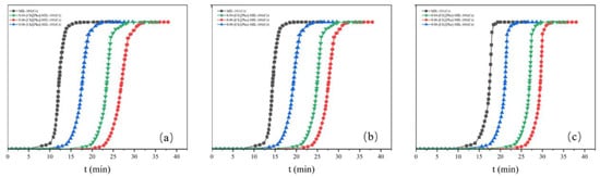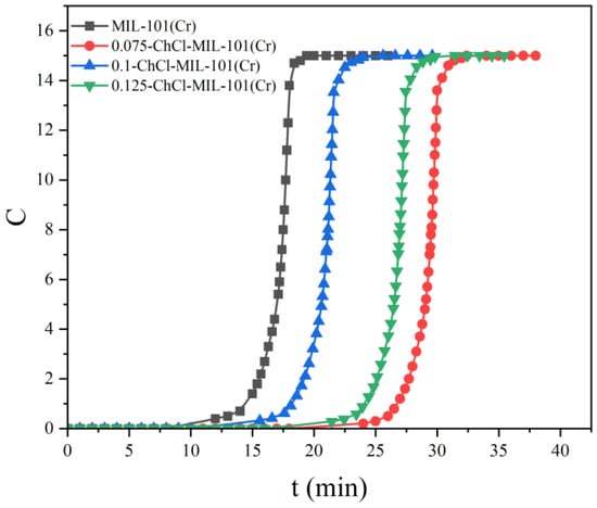 The CO2/N2 Adsorption Selectivity of the adsorbents MIL-101 (Cr), 0.075-ChCl-MIL-101 (Cr), 0.1-ChCl-MIL-101 (Cr), and 0.125-ChCl-MIL-101 (Cr) are shown in the Figure 15. From the perspective of adsorption kinetics, as the concentration of carbon dioxide in the mixed gas decreases, the adsorption breakthrough times of the four adsorption materials all show a gradually increasing trend. Specifically, the adsorption breakthrough time of 0.04-[Ch][Phe]-MIL-101(Cr) is extended by approximately 4 min, that of 0.06-[Ch][Phe]-MIL-101(Cr) is extended by about 5 min, and that of 0.08-[Ch][Phe]-MIL-101(Cr) is extended by around 6 min. This phenomenon indicates that a lower carbon dioxide concentration slows down the diffusion rate of gas molecules within the pore channels of the adsorbent and reduces the effective collision frequency with the adsorption active sites, thus delaying the process of adsorption saturation and leading to an increase in the adsorption breakthrough time.