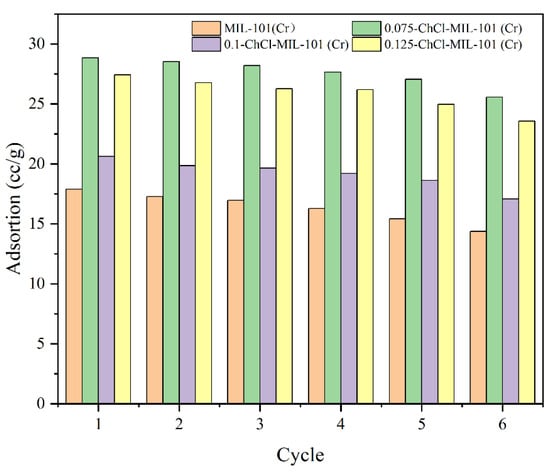In terms of future research directions, this study has opened up several important paths for follow-up exploration. First, it is possible to further investigate the synergistic mechanisms between different modifiers and MIL-101(Cr). Instead of being limited to choline chloride, other organic or inorganic modifiers with special functions can be introduced, and more diversified composite methods can be explored to achieve further breakthroughs in the material’s adsorption performance, for example, enhancing its resistance to specific gas impurities and improving its adsorption stability under complex working conditions. Second, this study has only examined a limited range of experimental conditions. In the future, the experimental scope can be expanded to study the adsorption performance of the material under a wider range of temperatures, pressures, and gas compositions, and a more complete performance database can be established to provide more comprehensive data support for practical engineering applications.