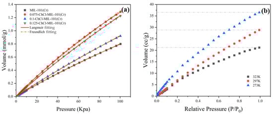 CO2 adsorption isotherms: (a) Under the environment of 298 K (b) 0.075-ChCl-MIL-101 (Cr) under the environments of 273 K, 297 K, and 323 K.
