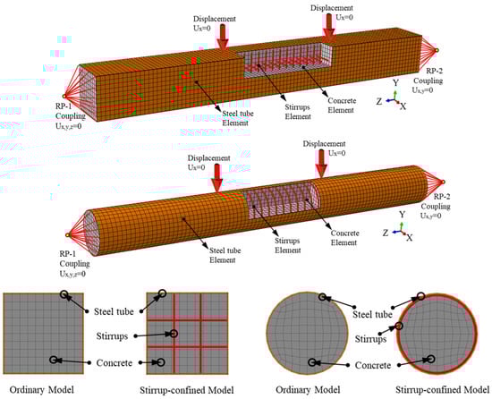 The finite element model (FEM) for square and circular desert sand concrete-filled steel tube (DS-CFST) members under pure bending is developed using Abaqus 2020 Standard solver finite element (FE) software. The steel tube is simulated using a 4-node reduced integration shell element (S4R), while the DS concrete and cover plate are modeled with a three-dimensional 8-node reduced solid integration element (C3D8R). Stirrup reinforcement is modeled using truss elements (T3D2). The overall model uses structured meshing techniques, with a mesh size of D/10, as suggested by Ding et al. [44], to improve computational efficiency and accuracy. Schematic diagrams of the components are shown in Figure 1. Material and geometric nonlinearities are incorporated, and an incremental iterative method is employed to solve the model.