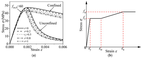 The constitutive model for the steel components, including stirrups and steel tubes, is based on an elastic-plastic model proposed by Ding et al. [44] and is expressed as follows: