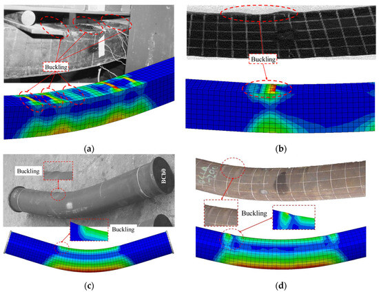 Comparison of experimental and FE failure mechanisms of specimens: Square (a) Brian Uy [30], (b) Han et al. [25]; Circular (c) Yang et al. [32], (d) Han et al. [31].