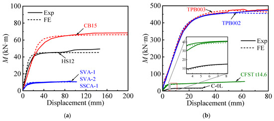 Comparison of experimental and FE-predicted moment-displacement curves: (a) Square; (b) Circular.