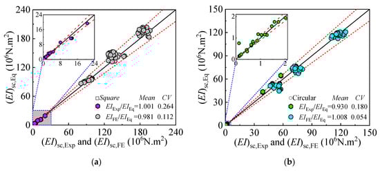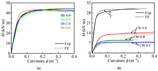 Comparison of experimental and FE-predicted moment-curvature curves: (a) Square; (b) Circular.