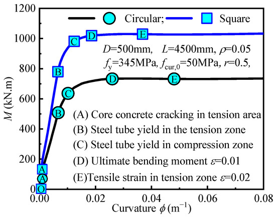 The bending moment-curvature curves for square and circular concrete-filled steel tube (CFST) sections under pure bending are shown in Figure 6. These curves show that both square and circular sections undergo three distinct stages before failure: the elastic stage (OB), the elastic-plastic stage (BD), and the plastic stage (DE). Key points include: Point A, where the concrete in the tension zone begins to crack; Points B and C, where the steel tube yields in the tension and compression zones, respectively; and Points D and E, where the strain in the steel tube in the tension zone reaches ε = 0.01 and ε = 0.02, respectively. During the elastic stage (OB), the bending moment increases rapidly with minimal curvature change. Concrete cracking at Point A slightly reduces stiffness, but the member remains elastic until the steel tube in the tension zone yields at Point B. The bond between the concrete and the steel tube limits crack propagation. In the elastic-plastic stage (BD), after yielding at Point B, deformation accelerates, and the compression zone steel yields at Point C. The yielding of the tension zone steel reduces stiffness, while the compression zone continues to provide support. As the load increases, the neutral axis shifts, and the yield zone expands. In the strain hardening stage (BC), curvature increases rapidly due to strain hardening and stress redistribution, while the bending moment increases at a slower rate. The curve flattens, indicating good ductility and the neutral axis stabilizes.