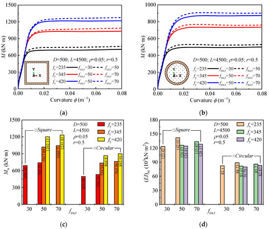 The influence of material strength on the moment-curvature curve, ultimate bending moment, and flexural stiffness is shown in Figure 7. Concrete strength (fcu,r) has a minimal effect on the ultimate bending moment, while steel strength plays a more significant role. As steel grade (fy) increases from 235 MPa to 345 MPa, the ultimate bending moment increases by approximately 37.9% for square sections and 38.5% for circular sections. Further increases in steel grade from 345 MPa to 420 MPa result in smaller increases in the moment (15.2% for square and 13.3% for circular sections). Regarding flexural stiffness, increasing concrete strength slightly improves stiffness, while higher steel strength reduces it. Numerically, the initial slope of the moment-curvature curve (from Figure 7a,b) decreases as the steel grade increases, indicating a reduction in the flexural stiffness. This reduction is due to the increased brittleness of higher-strength steel, which reduces the steel’s ability to deform and redistribute stresses, thus lowering the overall bending stiffness despite the increased moment capacity.