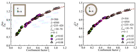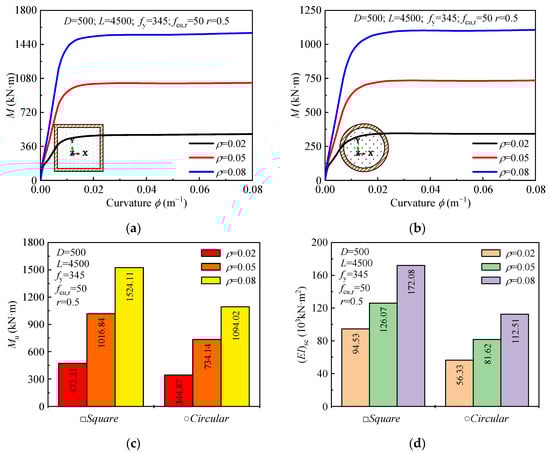 The influence of the steel ratio (ρ) on the moment-curvature curve, ultimate bending moment, and flexural stiffness is presented in Figure 8. As the steel ratio increases from 0.02 to 0.05, the ultimate bending moment increases by 115.3% for square sections and 112.9% for circular sections. When the steel ratio is further increased from 0.05 to 0.08, the ultimate bending moment increases by 49% for both square and circular sections. Additionally, the flexural stiffness of the sections increases with the steel ratio. Specifically, as the steel ratio increases from 0.02 to 0.05 and 0.08, the flexural stiffness increases by 33.4% and 36.5% for square sections, and 44.9% and 37.9% for circular sections, respectively.