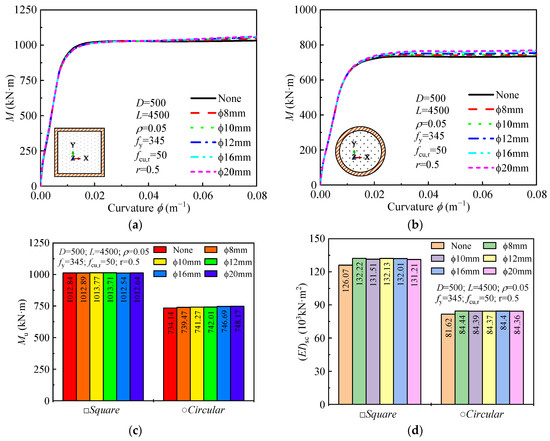 The influence of stirrup confinement on the moment-curvature curve, ultimate bending moment, and flexural stiffness is shown in Figure 9. The moment-curvature curves for different stirrup sizes closely overlap, indicating that stirrup confinement does not significantly alter the bending performance of the DS-CFST members. In the elastic region, the curves show a steep increase in bending moment with respect to curvature, which flattens out as the section moves into the plastic region, typical of CFST behavior. While there are minor variations in the plastic stage with increasing stirrup diameter (ϕ), these changes are minimal, suggesting that stirrup confinement has a small effect on the overall bending behavior. As the stirrup diameter increases from 8 mm to 20 mm, the ultimate bending moment and flexural stiffness increase by less than 5%. This minimal effect is consistent with findings from Ding et al. [19], who also reported a limited contribution of stirrup confinement to the bending performance of CFST columns.