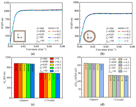 Effect of r on: (a,b) moment-curvature curves; (c) ultimate moment; (d) and flexural stiffness.