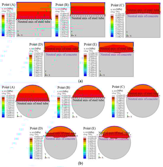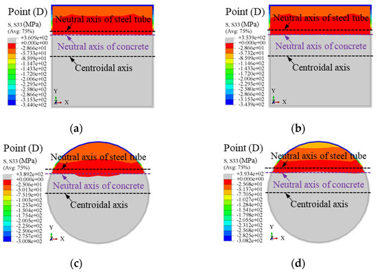 Taking square and circular CFSTs with dimensions D = 500 mm, member length L = 4500 mm, concrete compressive strength fcu,r = 50 MPa, steel yield strength fy = 345 MPa, steel ratio ρ = 0.05, and stirrup ratio ρsa = 0.0245 as examples, the longitudinal stress contours at the mid-span section under pure bending at the ultimate bending moment (Point D) are shown in Figure 13. The gray areas indicate tension zones, while darker colors represent higher compressive stresses. The following observations are made: (1) Square Sections: The neutral axis of the concrete is closer to the centroidal axis than that of the steel tube, indicating the concrete’s primary role in resisting compressive stresses. Stress distribution in square sections is less uniform due to geometric stress concentrations at the corners. The stirrup-confined square section (ρsa = 0.0245) shows no significant change in stress distribution compared to the ordinary square section (ρsa = 0), indicating that stirrup confinement has minimal influence on bending performance in square sections (see Figure 13a,b). (2) Circular Sections: The neutral axis of the concrete is closer to the centroidal axis than that of the steel tube, reflecting more balanced stress sharing. Circular sections demonstrate better stress distribution and reduced stress gradients due to their symmetric geometry. Stirrup confinement (ρsa = 0.0245) slightly improves stress uniformity, but the improvement is marginal, as the ordinary circular model (ρsa = 0) already exhibits effective confinement and stress distribution (see Figure 13c,d). (3) Stirrup Confinement: Across both square and circular sections, stirrup confinement has a negligible impact on stress distribution under pure bending, as evidenced by the minimal numerical differences in stress contours. This suggests that section geometry plays a more significant role in stress sharing than stirrup confinement.