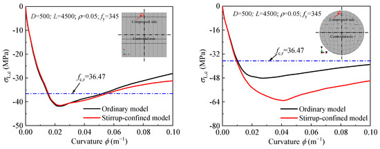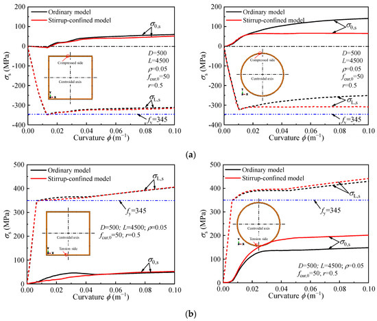 Effect of stirrup confinement on the stress-curvature curve of the steel tube: (a) Compression Side; (b) Tension side.