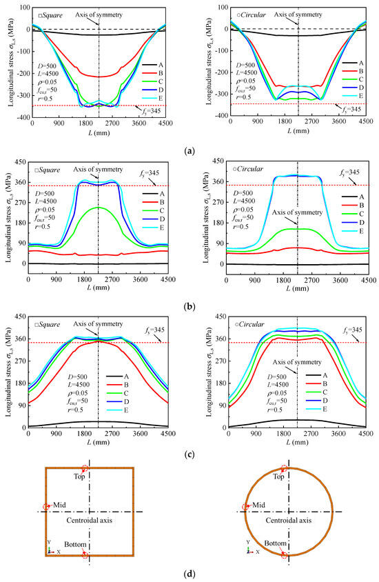 Development of the longitudinal stress in the steel tube along the length of the specimen at different loading stages: (a) Top; (b) Mid; (c) Bottom; (d) Marked points along the steel tube for stress analysis.