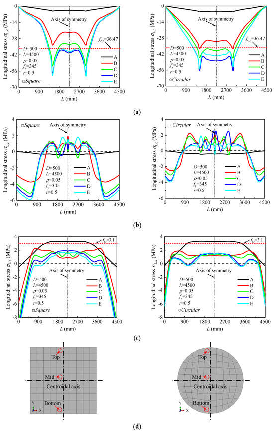 Comparison of longitudinal stress contours at mid-span section: (a) square ordinary (ρsa = 0); (b) square stirrup-confined (ρsa = 0.0245); (c) circular ordinary (ρsa = 0); (d) and circular stirrup-confined (ρsa = 0.0245).