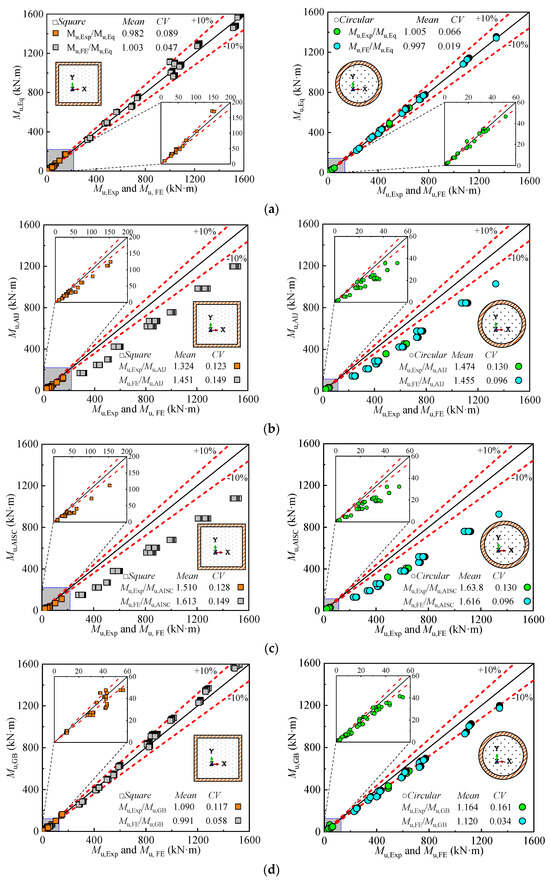 To validate the finite element model, numerical simulations were conducted on pure bending tests of square and circular concrete-filled steel tubular (CFST) members, as reported in previous studies. The comparison between the FEM results and experimentally measured ultimate bending moments is presented in Table 1 for square sections and Table 2 for circular sections. For square sections, the average ratio of experimentally measured to FEM-calculated ultimate bending moments (Mue/Mu,FE) is 1.026, with a coefficient of variation (CV) of 0.072. For circular sections, the average ratio is 1.033, with a CV of 0.076. These results demonstrate that the FEM accurately simulates the pure bending behavior of both square and circular CFST members, with low CV values indicating consistency and reliability in the predictions.