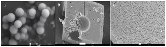 Figure 2 illustrates the morphologies of carbon spheres and cubic Mn2O3. According to the SEM image presented in Figure 2a, it can be observed that carbon spheres are intact and have uniform size ranging from 800 nm to 1.5 μm. From Figure 2b, Mn2O3 maintains a complete cubic shape with size around 6–8 μm. However, there are numerous spherical concaves on the particle surface, and the dimensions of these concaves are similar to those of carbon spheres. It can be inferred that these concaves were formed during the calcining process of carbon spheres. Additionally, as shown in the partially enlarged image (Figure 2c), the Mn2O3 cubic structure has some interconnected channels with a width of more than 20 nm. These channels may result from both the decomposition of MnCO3 and the oxidation of carbon spheres during calcination [41]. The release of CO2 contributes to the channel formation. Furthermore, PVP as a soft template also releases CO2 during this process [42], leading to the formation of more gaps on the surface of the Mn2O3 cubic structure.