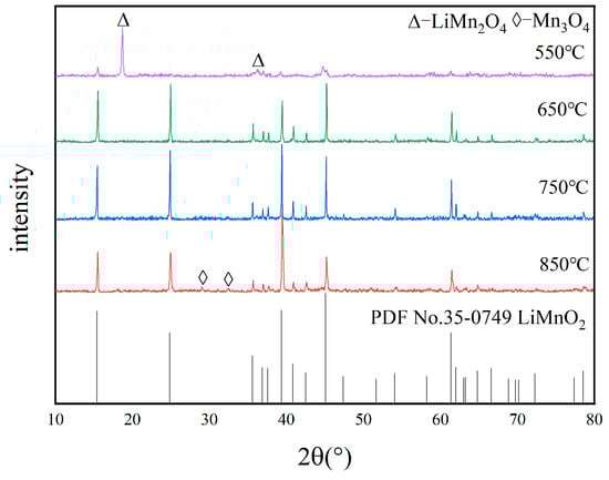 Li2CO3, porous Mn2O3, 5% (equivalent to the mass of Mn2O3) of glucose, and an appropriate amount of anhydrous ethanol were thoroughly ground to fully and evenly mix them. Then, the mixture was calcined in a closed tube furnace with nitrogen blowing at 750 °C for 6 h to obtain LiMnO2. Finally, LiMnO2 was roasted at 450 °C for 6 h to synthesize the precursor Li1.6Mn1.6O4 [40].