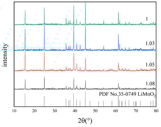 Figure 4 illustrates the XRD patterns of samples synthesized at various molar ratios of lithium to manganese (Li/Mn). It can be observed from Figure 4 that pure LiMnO2 can be successfully obtained no matter what the Li/Mn ratio is. But as the Li/Mn ratio reaches 1.03, the resulting diffraction peaks are sharper compared to those with other ratios, and the crystallization is also more complete. When the Li/Mn ratio is 1.05 and 1.08, the intensity of the LiMnO2 diffraction peak is weaker compared to that observed at a Li/Mn ratio of 1.03. An excessive Li/Mn ratio results in a large amount of Li+ entering into the structure, even affecting the transition element layer [32]. This impacts the structural integrity of LiMnO2, resulting in poor crystallinity and a mixing phenomenon of cations within the precursor [43]. From an economic perspective, a Li/Mn ratio of 1.03 represents an optimal choice.