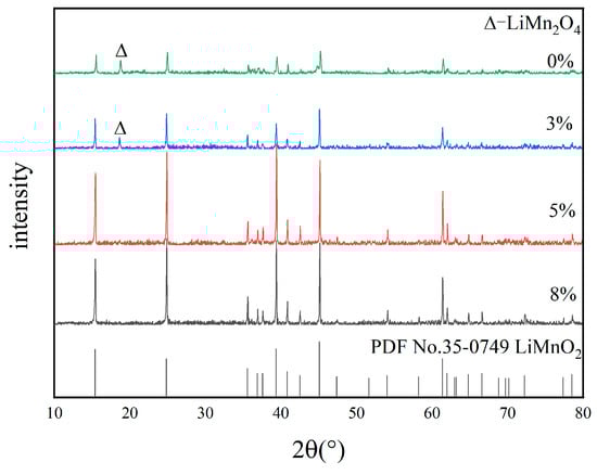 Figure 5 presents the XRD patterns of LiMnO2 synthesized with various amount of glucose (relative to Mn). As shown in Figure 5, the intensity of impurity peaks is weaker, and the LiMnO2 main peak becomes sharper with the increase in glucose content. LiMn2O4 impurity peaks are observed for the blank and 3% glucose. In contrast, pure LiMnO2 can be obtained when the glucose content exceeds 5%. Glucose does not affect the composition of subsequent products. The presence of LiMn2O4 impurity primarily arises from the decomposition of a portion of Mn2O3 during the high-temperature synthesis process of LiMnO2, leading to small quantities of Mn3O4 and O2 [37]. This part of Mn3O4 and O2 subsequently reacts with lithium to form LiMn2O4. Simultaneity, excess O2 when glucose is insufficient may also oxidize a minor amount of LiMnO2 into LiMn2O4. The relevant chemical equations are shown in (9) and (10):