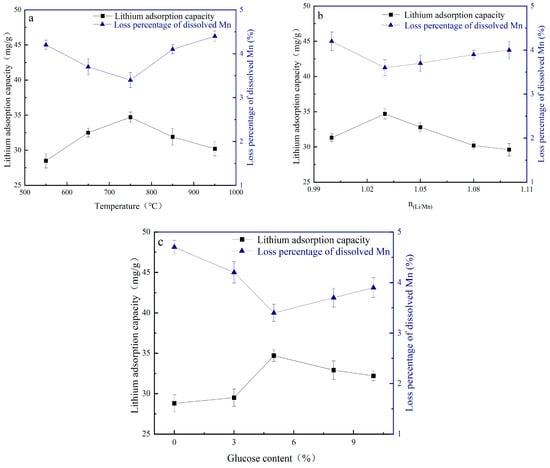 The loss percentage of dissolved Mn and corresponding adsorption capacity at different (a) calcination temperatures, (b) molar ratios of Li/Mn, and (c) glucose contents.