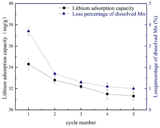 The loss percentage of dissolved Mn during acid pickling and Li+ adsorption capacity were determined over multiple cycles. The results are illustrated in Figure 8. During the initial three cycles, the loss of dissolved Mn is due to the Mn3+ disproportion reaction in hydrochloric acid [51]. After three cycles, nearly all Mn3+ was dissolved, and the percentage of Mn dissolution loss presented a constant value approximately 1%. This stability can be attributed to the formation of high-purity precursor Li1.6Mn1.6O4 following the roasting of LiMnO2 without impurities. Figure 8 also demonstrates that the lithium adsorption capacity decreases as the number of cycles increases. This reduction can be attributed to the H+–Li+ ion exchange process during the acid pickling, where H+ possesses smaller ionic radius compared to Li+ [52]. During the adsorption process, this exchange between Li+ and H+ inevitably leads to a contraction of the crystal structure. Consequently, this phenomenon hinders both diffusion and embedding of Li+ into the crystal lattice, ultimately leading to a decreased lithium adsorption capacity. After five cycles, the adsorption capacity remained more than 30 mg/g, and recovery rate was about 85%. The resulting lithium ion sieve therefore exhibits high stability during cycling.