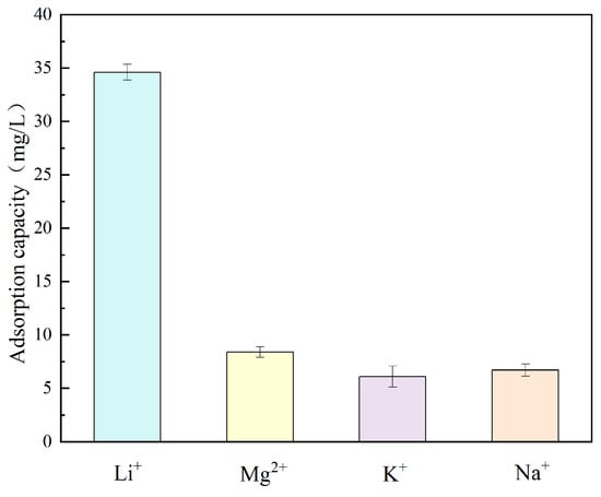 The existence of various ions in salt lake brine has a significant impact on the Li+ adsorption effect of the lithium ion sieve. Figure 9 demonstrates the adsorption capacity of H1.6Mn1.6O4 for Li+, Mg2+, K+, and Na+. H1.6Mn1.6O4 has the highest adsorption capacity for Li+ compared to Mg2+, K+, and Na+, and the distribution coefficient of Li+ is much larger than that of other ions. These results indicate the synthesized lithium ion sieve exhibits exceptional selectivity for Li+.