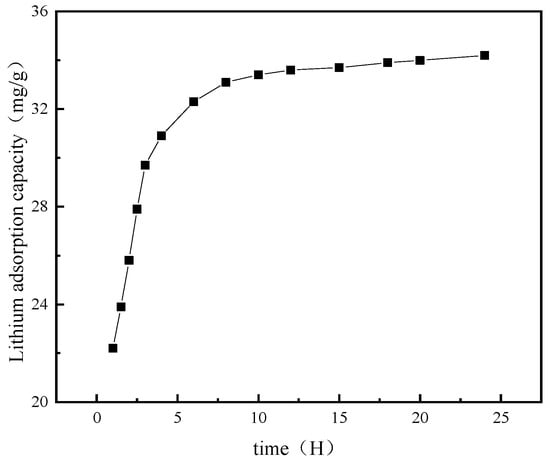 The variation in adsorption capacity over time is illustrated in Figure 10. As shown, adsorption capacity progressively enhances over time. The initial adsorption rate is notably rapid during the first stage but subsequently slows down. This is due to the fact that there are numerous lithium vacancies exhibiting a memory effect within the spinel structure after acid pickling. Additionally, a significant concentration gradient of Li+ between brine and the interior of ion sieve is beneficial for Li+ to enter into the crystal lattice and cause exchange with H+ [53]. However, H+ in H1.6Mn1.6O4 enters into the solution as time goes by, leading to an increase in the concentration of H+. Simultaneously, as Li+ is adsorbed into the ion sieve, there is a decline in the Li+ concentration in brine. These factors hinder both the Li+–H+ exchange and overall adsorption processes. Thus, the initial rate of adsorption is fast, while the subsequent adsorption rate gradually becomes gentle.