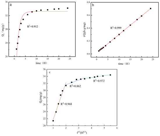 Fitting results of (a) pseudo-first-order dynamics, (b) pseudo-second-order dynamics, and (c) intraparticle diffusion model.