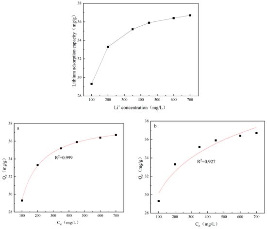 Figure 12 presents the adsorption isotherm of the lithium ion sieve and the fitting results with Langmuir and Freundlich models. With the increase in Li+ concentration in the solution, the adsorption capacity of H1.6Mn1.6O4 also correspondingly increases. The correlation coefficient based on the Langmuir equation is 0.999, while that of the Freundlich model is just 0.927. The results indicate that the adsorption process of H1.6Mn1.6O4 belongs to monolayer adsorption.