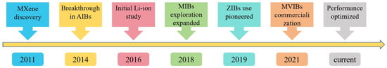 In 2011, MXene was discovered and began to be noticed and used as a new material for metal–ion batteries; in 2014, a breakthrough was made in MXene-based aluminum–ion batteries (AIBs), which provided a direction for MXene to be explored in MVIBs; in 2016, preliminary lithium–ion research was launched, and MXene’s material properties were explored in depth; in 2018, MXene-based magnesium–ion batteries (MIBs) appeared and attracted attention; in 2019, the MXene-based zinc–ion battery (ZIB) was pioneered as an application of MVIB; in 2021, the multivalent¬–ion battery (MVIB) was commercialized, which could not be separated from the success of MXene’s many years of research accumulated in various ion battery systems. Currently, with the deepening of research, the performance of MXene combined with ion batteries has been optimized, and the application prospect is becoming more and more promising. These key points in chronological order clearly show the complete development of MXene and ion batteries from material discovery, and technological breakthroughs to application expansion and commercialization, as shown in Figure 1.