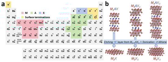 MXenes are transition metal carbides, nitrides, and carbon–nitrides with an Mn+1XnTx formula, whose precursors were commonly designated as MAX phases [28]. As shown in Figure 2a, M represents early transition metal atoms, including any one of Sc, Ti, V, Cr, Mn, Zr, Nb, Mo, Hf, Ta, and W; A mainly consists of metallic and nonmetallic elements between the second and the fourth main groups, such as Al, Si, P, S, Ga, Ge, As, Cd, In, Sn, T, and Pb; X sites can be occupied by carbon, nitrogen, or both; n can vary from 1 to 4, and Tx (where x is variable) indicates surface terminations on the surface of the outer transition metal layers [29].