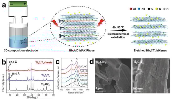 (a) A schematic illustration of the exfoliation and delamination process of the Nb2AlC MAX phase via electrochemical etching. The red lightning symbol indicates electrical drive. Reproduced with permission [78]. Copyright 2020, Wiley-VCH. (b) The X-ray diffraction patterns of Ti3AlC2, Ti3C2Tx, and Ti3C2Tx thin films. Reproduced with permission [77]. Copyright 2018, Wiley-VCH. (c) The Raman spectra of amorphous carbon CDC synthesized by etching the MAX phase (namely Ti3SiC2, Ti3AlC2 and Ti2AlC) in HCl, NaCl or HF electrolytes. The letters D and G represent Raman spectral peaks, the G peak corresponds to the vibration in the sp2 hybridized carbon plane, and the D peak is the defect-induced peak. Reproduced with permission [80]. Copyright 2014, Wiley-VCH. (d) The representative SEM images of Ti3AlC2 and Ti3C2Tx. Reproduced with permission [77]. Copyright 2018, Wiley-VCH.