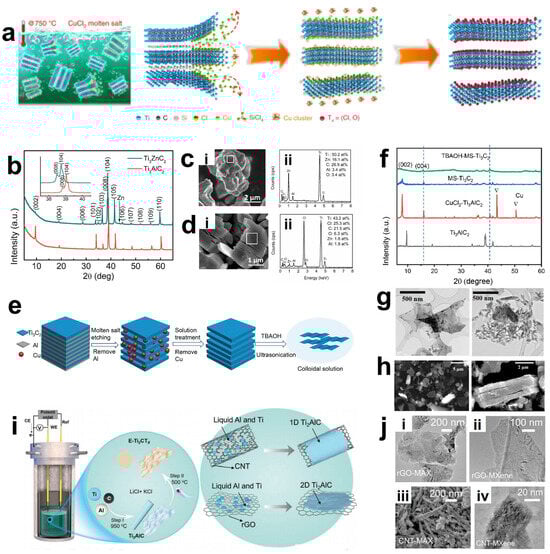 (a) Schematic diagram of Ti3C2Tx MXene preparation. Reproduced with permission [86]. Copyright 2020, Springer Nature. (b) XRD patterns of Ti3AlC2 and Ti3ZnC2. (c) SEM image (i) of Ti3ZnC2 and the corresponding energy-dispersive spectroscopy (EDS) spectrum (ii). (d) SEM image (i) of Ti3C2Cl2 and the corresponding EDS spectrum (ii). (b–d) Reproduced with permission [85]. Copyright 2019, American Chemical Society. (e) Molten salt synthesis method and exfoliation process. (f) X-ray diffraction (XRD) patterns of MAX phase precursors (black), MXene after removal from the molten salt bath (red), MXene after washing in APS to remove residual Cu (blue), and MXene after TBAOH stripping treatment (green). The triangular symbols indicate the characteristic diffraction positions where Cu2+ is reduced to Cu monomers remaining in the sample. (g,h) SEM maps of MS-Ti3C2Tx MXene treated with DMSO followed by sonication, and MS-Ti3C2Tx MXene treated with TBAOH for 24 h and 72 h TEM images of MS-Ti3C2Tx. (e–h) Reproduced with permission [87]. Copyright 2021, American Chemical Society. (i) Schematic diagram of a molten salt cell with (Ti, Al, C) pellets as working electrode, glassy carbon as reference electrode, and graphite crucible as counter electrode and a schematic diagram of the process for the preparation of Ti2AlC by using carbon nanotubes and reduced graphene oxide as the carbon source. (j) Ti2AlC MAX (i,iii) obtained by using graphene oxide and carbon nanotubes as the carbon source and Ti2CCl2 MXene (ii,iv) TEM images of the Ti2CCl2 MXene. (i,j) Reproduced with permission [81]. Copyright 2022, Wiley-VCH.