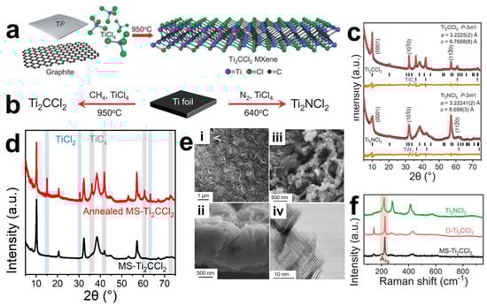 (a,b) Schematic of bottom-up direct synthesis of Ti2CCl2. (c) XRD patterns of CVD-Ti2CCl2 and CVD-Ti2NCl2. (d) Powder XRD pattern of the product of pure TiCCl MXene annealed at 950 °C for 1 day under vacuum. MXene partially decomposed into TiCl and TiC. XRD patterns of the final mixture were similar to that of DS-Ti2CCl2. (e) Front (i) and cross-section (ii) SEM images of CVD-Ti2CCl2. (iii) SEM image and (iv) STEM image showing that CVD-TiNCl exhibits a braided structure. (f) Raman spectra of CVD-Ti2CCl2 and CVD-Ti2NCl2 MXenes. [90]. Copyright 2023, American Association for the Advancement of Science (AAAS).