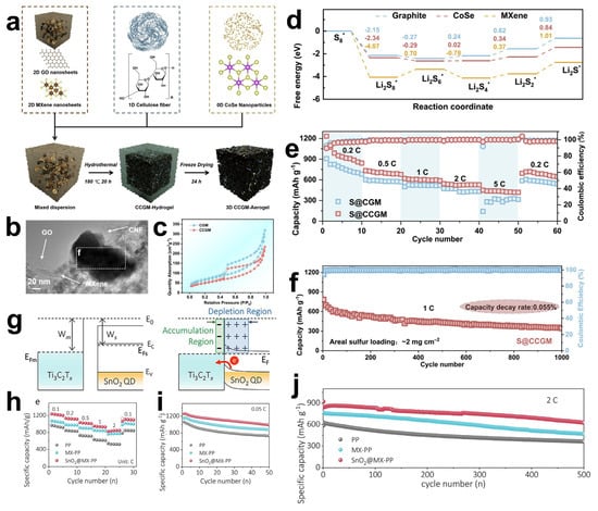 (a) Schematic diagram of the synthesis process of the three-dimensional CCGM aerogel. (b) Transmission electron microscope image of CCGM. (c) N2 adsorption–desorption isotherms of CGM and CCGM. (d) Relative Gibbs free energy spectra of reducing LiPSs on CoSe, graphene, and MXene substrates. The asterisk in the upper right corner represents the adsorption state in which the sulfur species adsorbed on the surface of the electrode material is in. (e) Rate performance of S@CGM and S@CCGM cathodes. (f) Long-term cycling stability of the S@CCGM electrode at a high current rate of 1C. (a–f) Reproduced with permission [26]. Copyright 2024, Elsevier BV. (g) Mott–Schottky type contact band diagrams of MXene (work function Wm = 4.37 eV) and SnO2 (work function Ws = 3.84 eV). (h) Rate performance of batteries with different separators at current rates from 0.1C to 2C. (i) Cycling performance at a small current rate of 0.05C. (j) Long-term cycling performance at a high current rate of 2C. (g–j) Reproduced with permission [148]. Copyright 2024, Springer Nature.